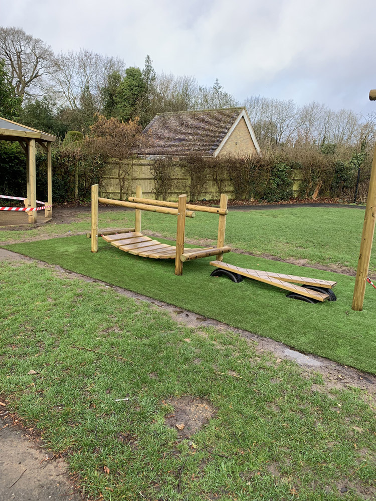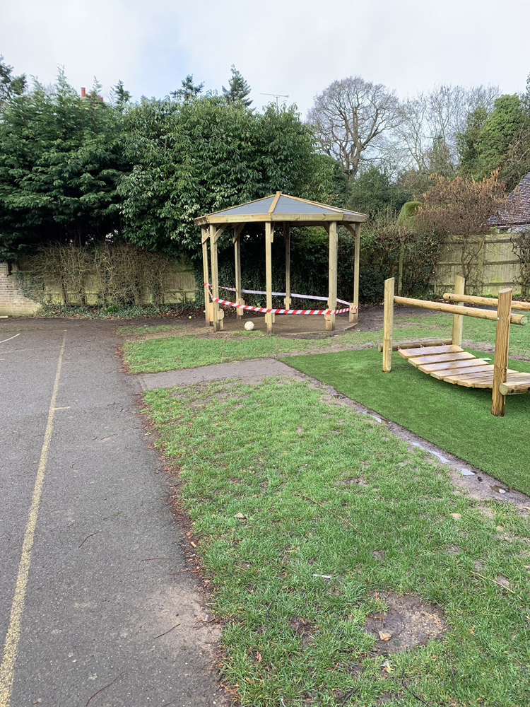 Little Gaddesden CofE Primary School is a small rural primary school. They were looking to update their tired playground equipment and develop new areas of interest for the children. As they are in a rural setting, any equipment needed to be sympathetic to their environment and surroundings. They wanted to replace the existing ‘ hut/ gazebo’ with something very similar but with low sides to enable visibility. They also wanted to update the existing trim trail and their EYFS space which need to allow for emergency vehicle access.