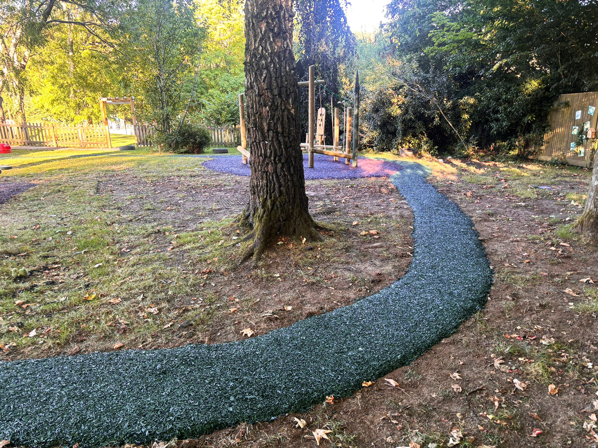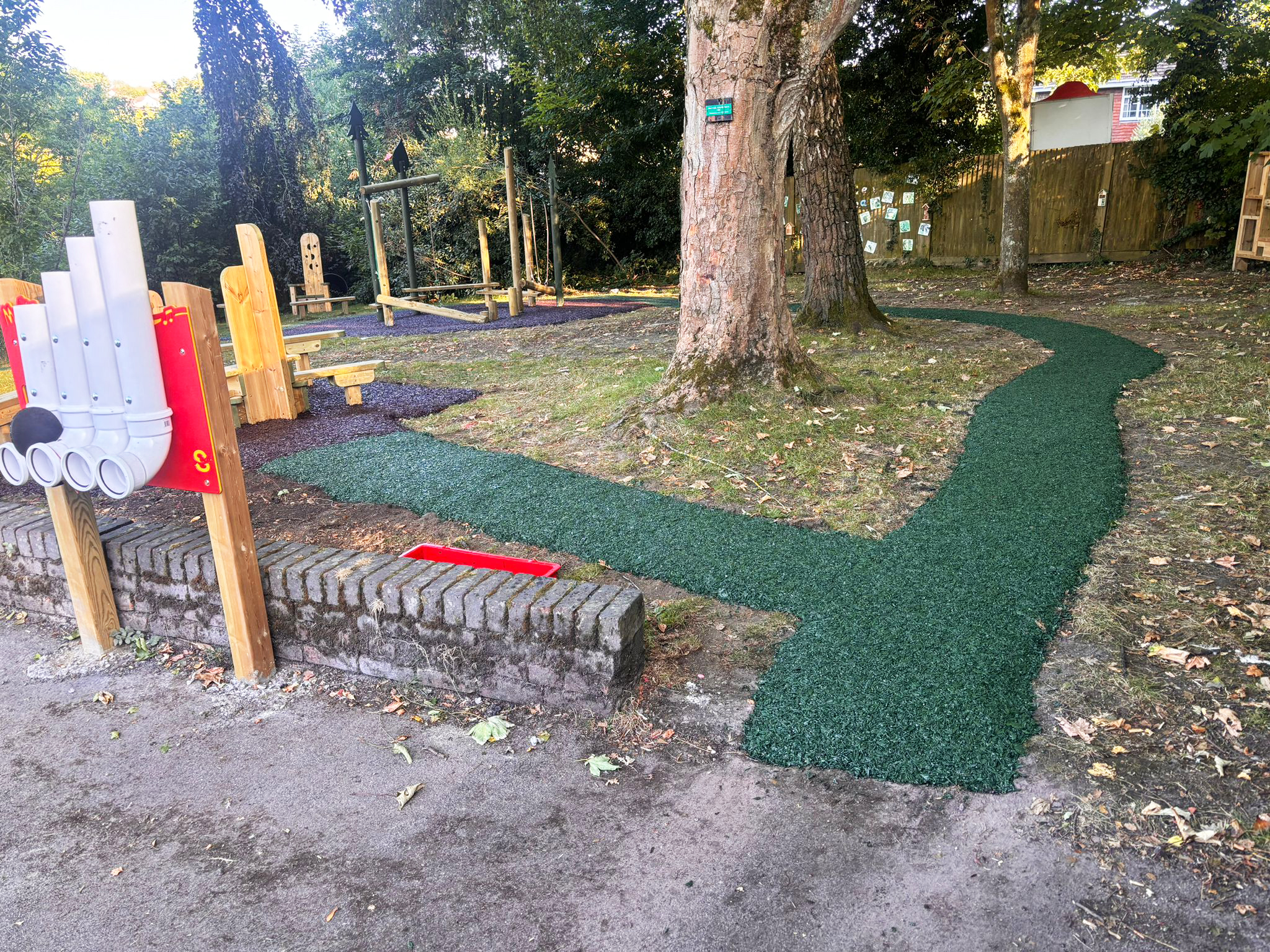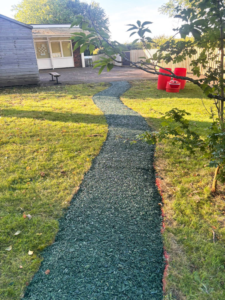 To improve access and connectivity, a new pathway was laid through the grass, linking the key zones and incorporating a surfaced central area ideal for moving play blocks and rotating activity setups throughout the year.