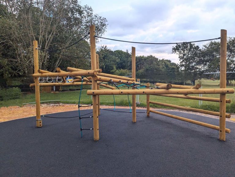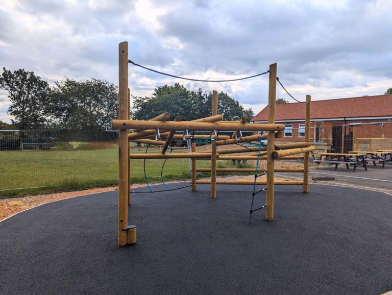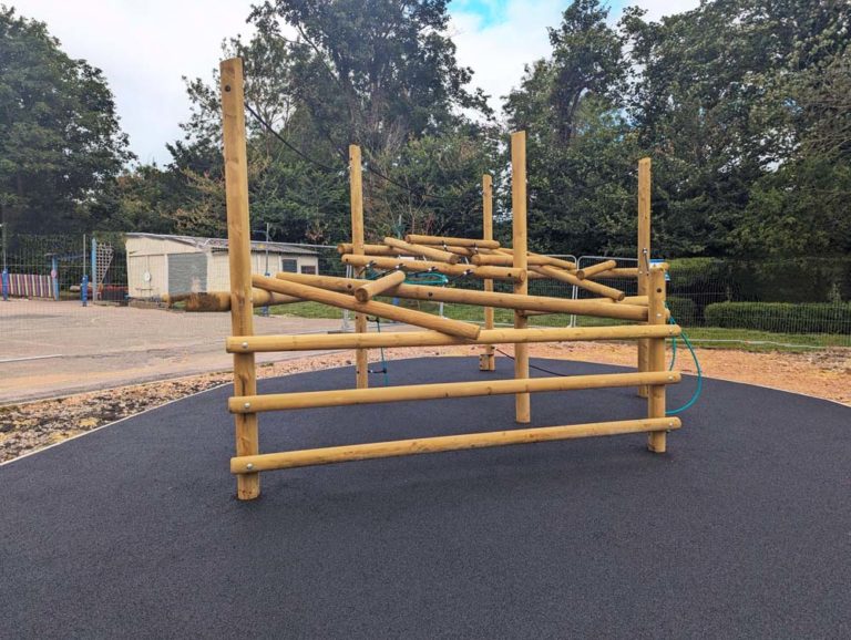 The school wanted a challenging climbing structure with a soft safety surface. ESP offered the Tangled Huntsman and a soft, black rubber wetpour safety surface to go around the climbing structure. ESP also finished the area off nicely with a block paving edge so the school can install another surface around this to ensure the area looks neat and tidy.