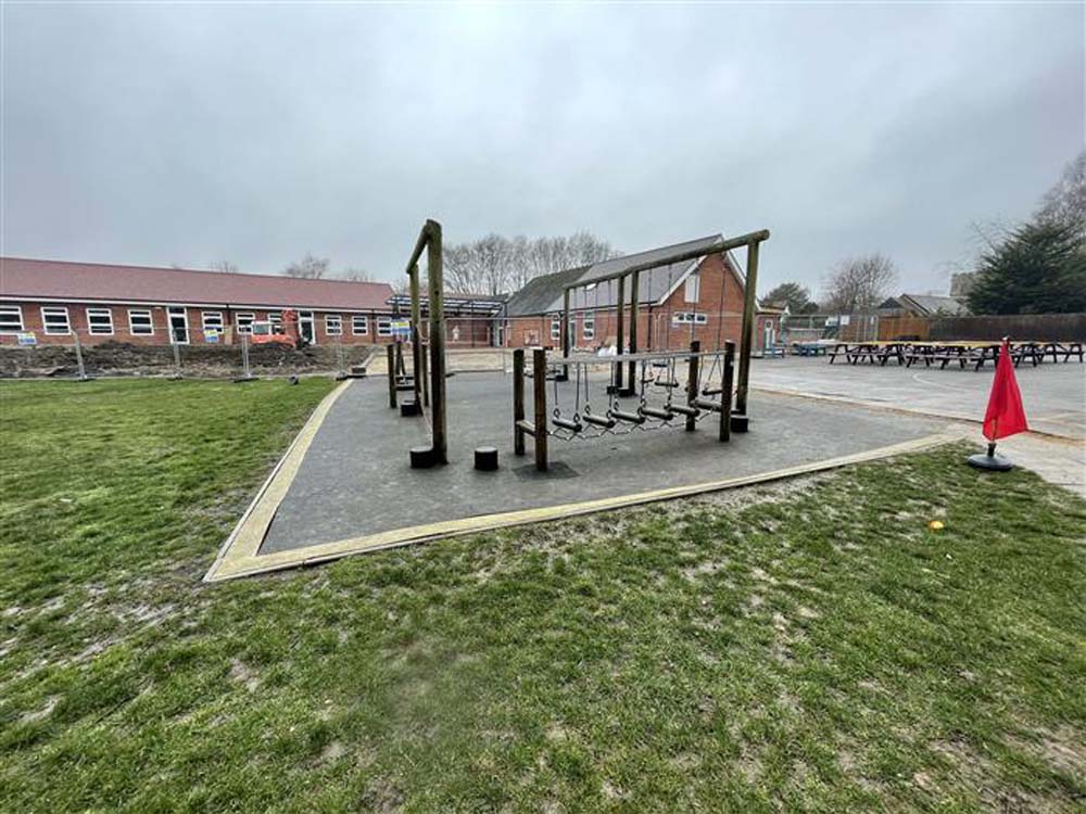 The school wanted a challenging climbing structure with a soft safety surface. ESP offered the Tangled Huntsman and a soft, black rubber wetpour safety surface to go around the climbing structure. ESP also finished the area off nicely with a block paving edge so the school can install another surface around this to ensure the area looks neat and tidy.