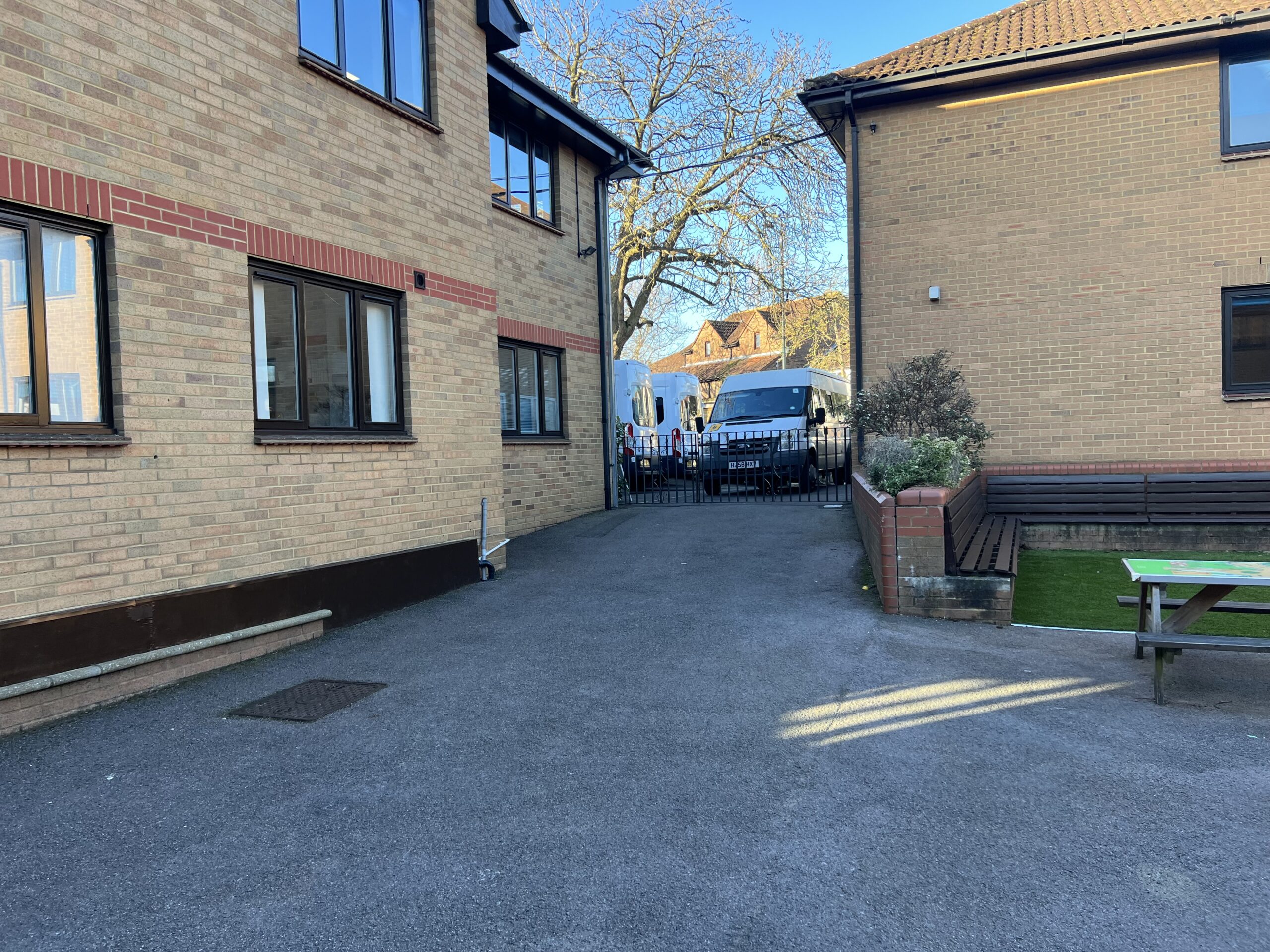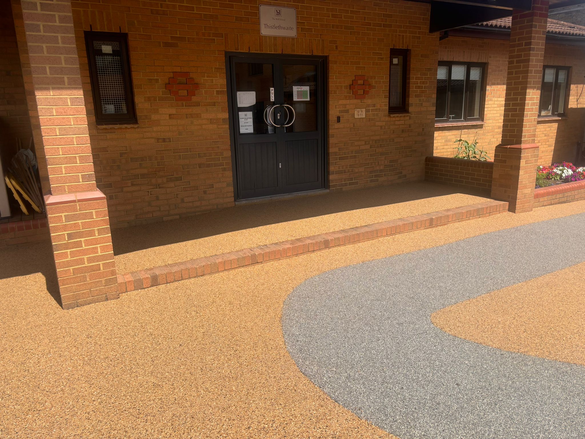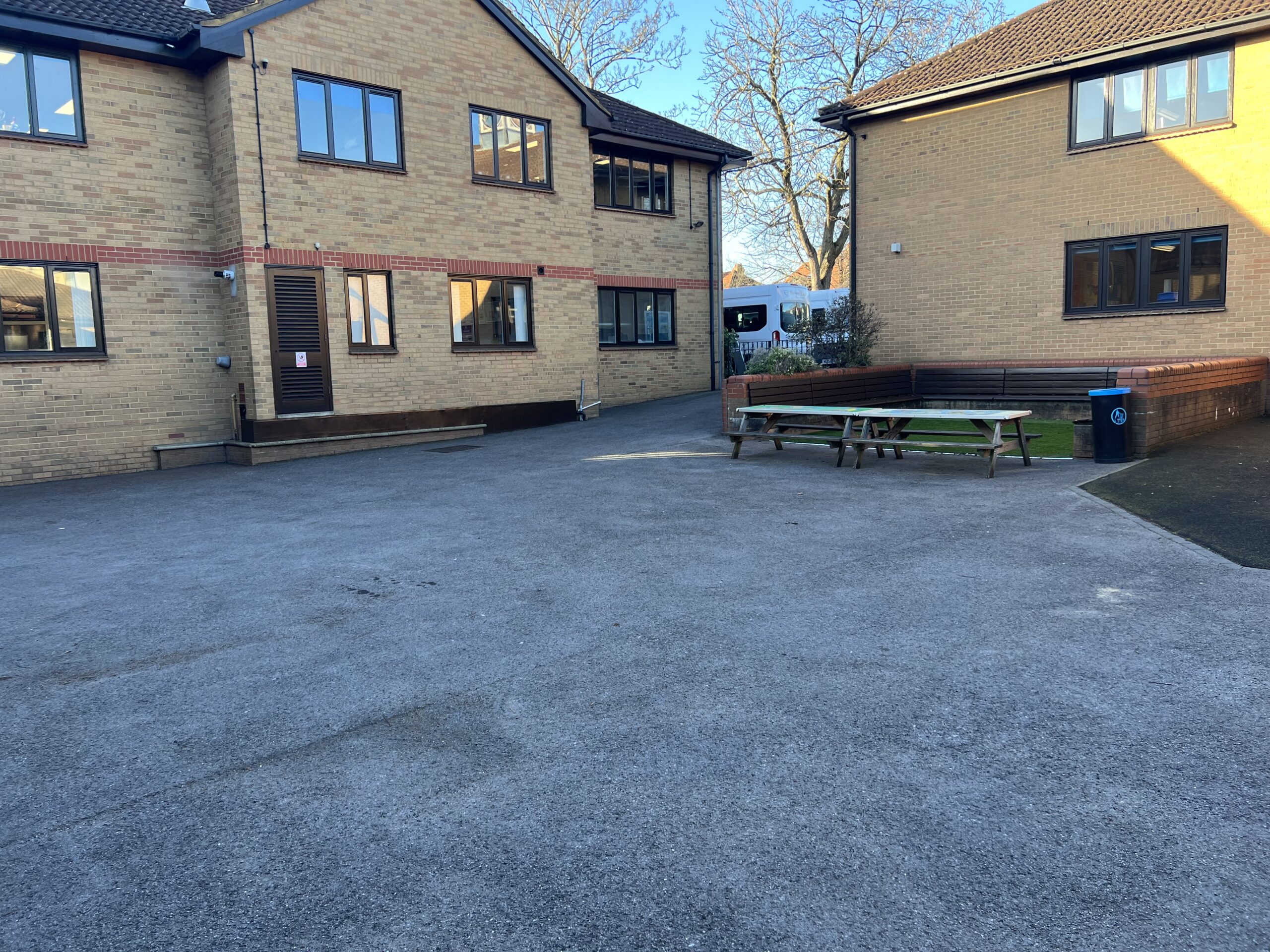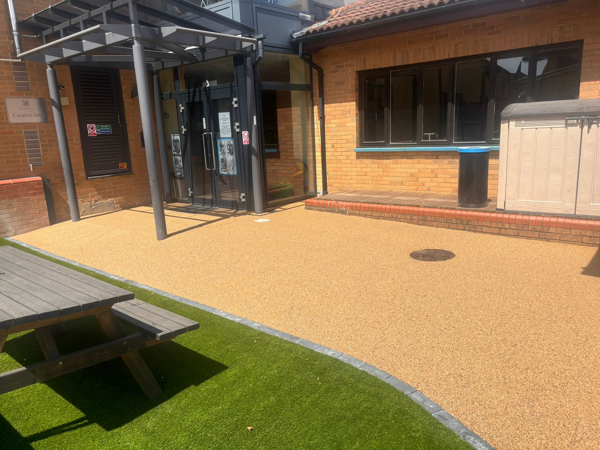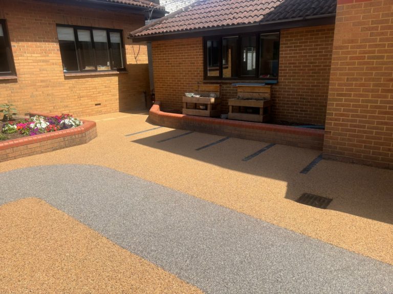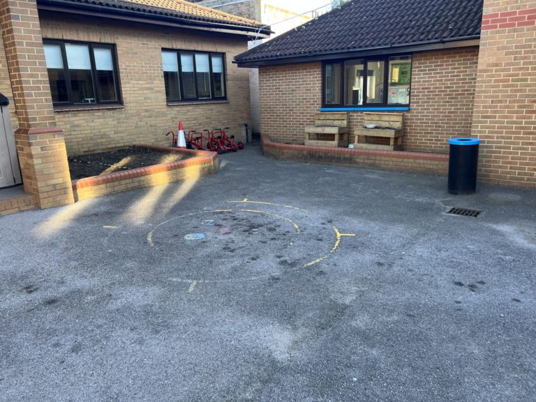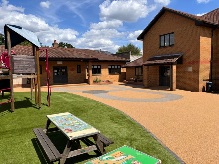 After the free site consultation and survey, the school enquired about incorporating a roadway into the surface. Traditionally, roadways are constructed with playground markings, wetpour, or block paving, so this was an unusual request for us. Our creative team crafted the roadway using silver/grey resin-bonded gravel, complete with a roundabout and parking bays. The maple resin-bound gravel provides a striking contrast. We installed our premium artificial grass beneath the existing structure and around the seating area. Furthermore, two long planters were placed on top of the new rubber mulch surfacing beneath the windows.