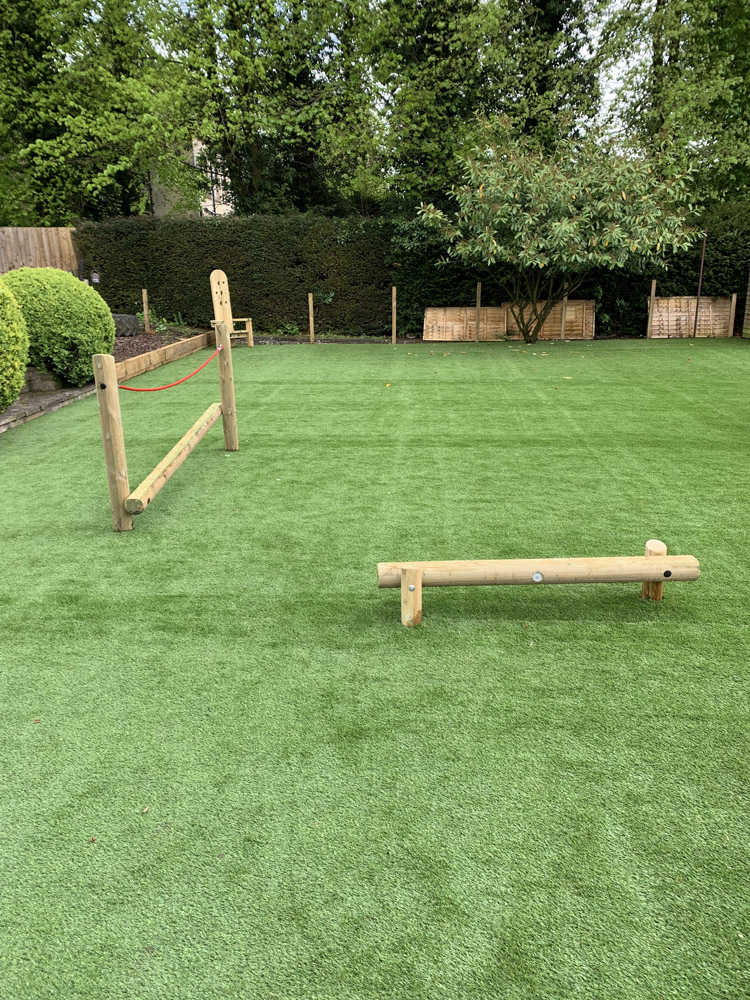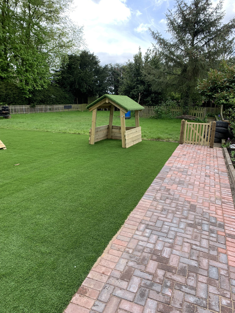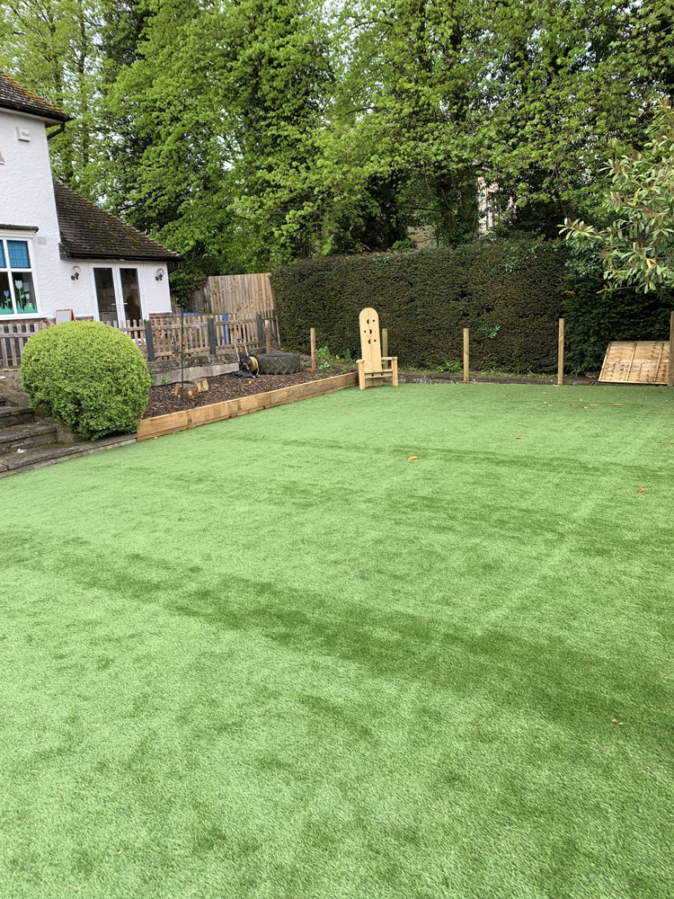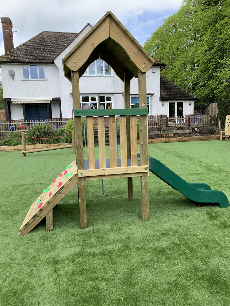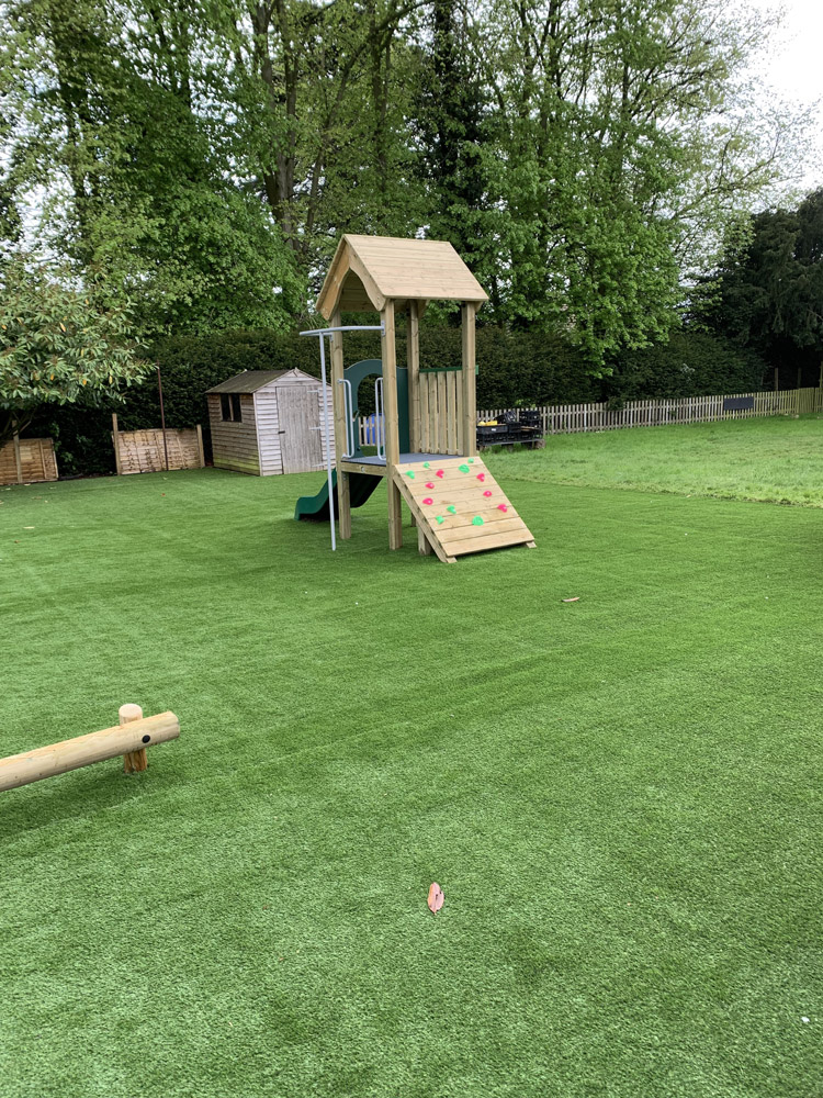 We installed approx. 250sqm of 40mm pile height artificial grass, which now offers a flat, level playing surface which is now free from standing water during inclement weather. In addition to this we supplied a bespoke play tower, replicating the unit which has proved to be an overwhelming success at Syston Day Nursery, a small trim trail to add extra activities, a story telling chair and a playhut.
