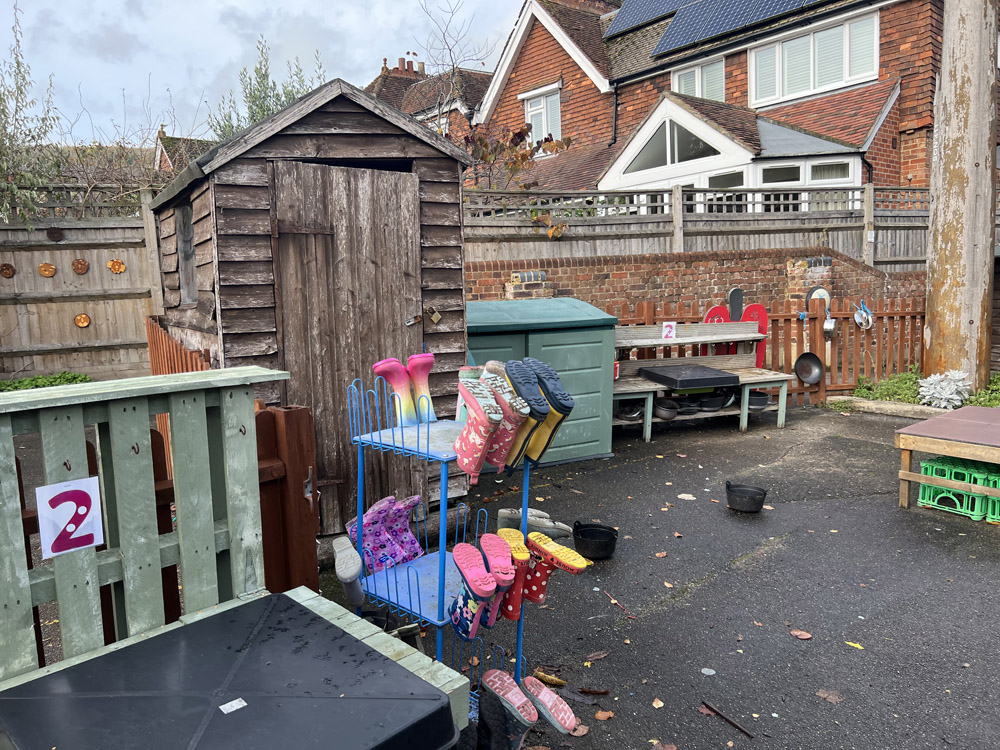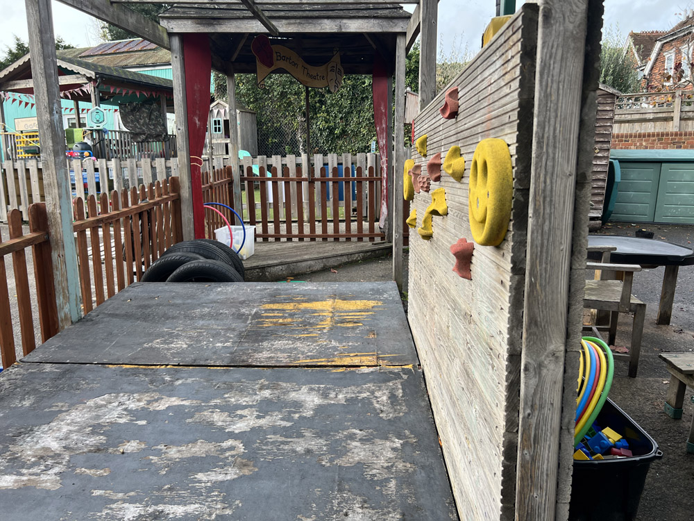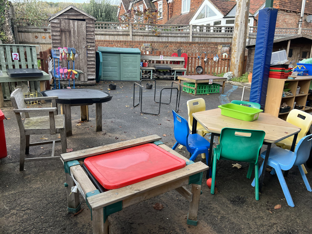 The schools existing EYFS area was dull and unorganised with lots of none fixed resources. They had a 30k budget which had a cut-off date to be spent. The area was quite small and lacked structure. The school were keen to resurface the area to create a natural feel incorporating chalkboards, storage, sandpit, playhuts, mud kitchen, messy tables, surfacing and water play.