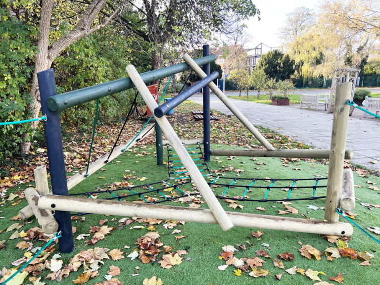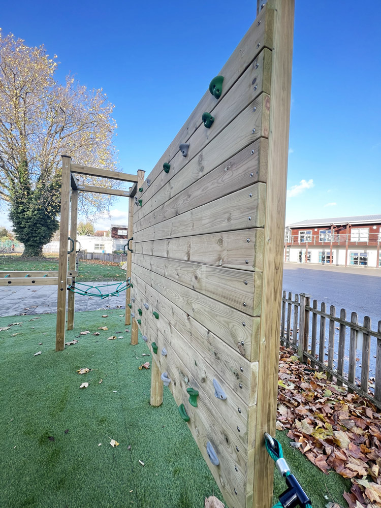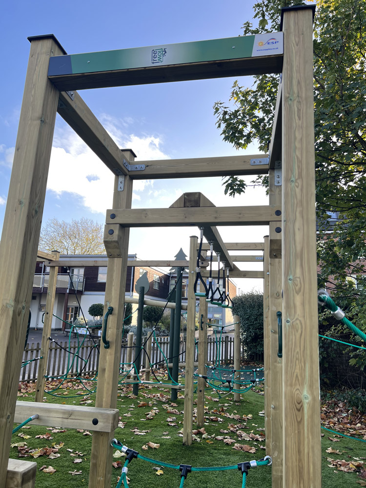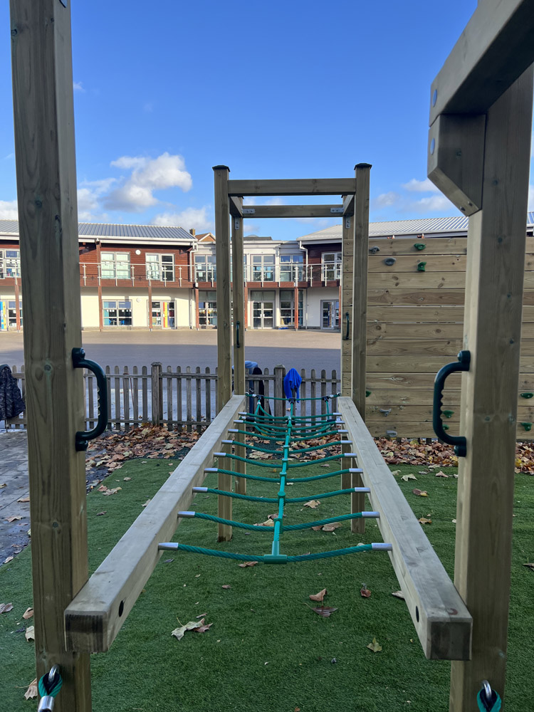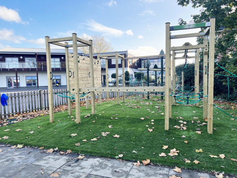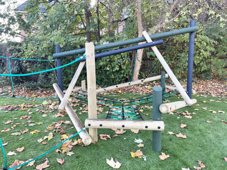 The irregular shape required a bespoke solution. Through our creative design service, we created a unique one of a kind climbing system that includes elements of our Tangled, Wildwood and Freeflow climbing ranged. These different styles offer children of a mixed age and ability level the freedom to think creatively, problem solve and take calculated risks when navigating different pathways around the equipment. To ensure the equipment is accessible all year round, an artificial grass safety surface was selected, preserving the natural feel of the area. Following all installations, standard or unique, a free of charge, independent post installation inspection is carried out to confirm the project is compliant and safe to use.