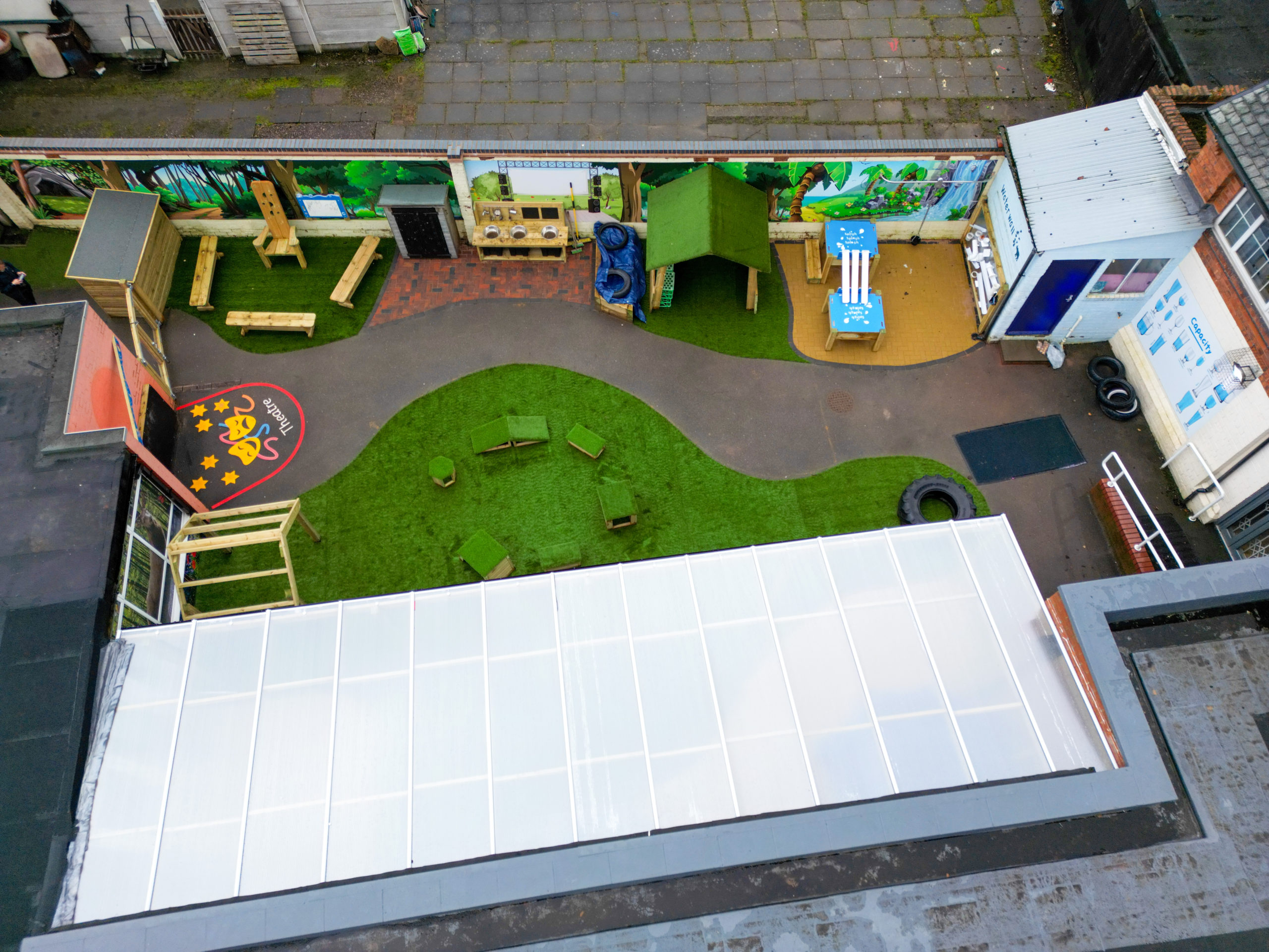 Between the two spaces, the connecting roadway was resurfaced with a new subbase and artificial grass, transforming it from a tired cut-through into an active learning space. Road markings now support physical movement, coordination and imaginative roleplay, and the new access points create a seamless flow between Reception and Nursery.