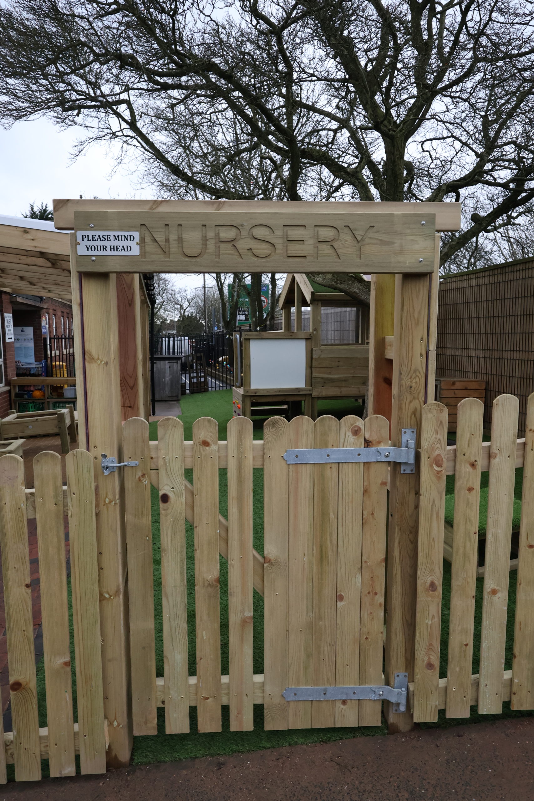 A major focus of the redesign was on developing physical skills and supporting communication and language development. However, this wasn’t about installing traditional climbing frames. The team wanted to encourage children to explore movement through grip strength, water pumping, block play, roleplay and more open-ended, sensory-based experiences. The tree in the Nursery area needed to be made safe and incorporated as a feature, rather than a problem to work around. The fencing and boundaries also needed rethinking, with a fixed gate into Nursery and a more flexible solution for separating off the bike area in Reception.