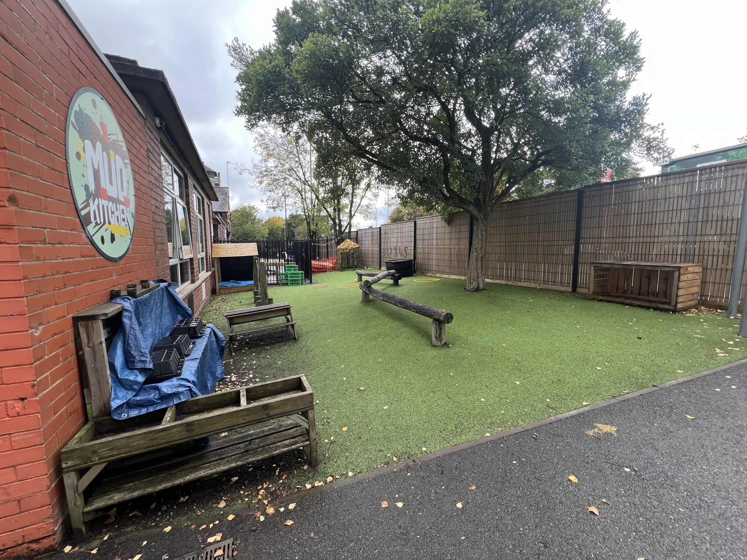 The result is a pair of completely transformed outdoor environments that now function as extensions of the classroom. In the Nursery, the new surfaces and fixed structures give the space lasting value and practical function. The tree has become a natural centrepiece, offering shelter and imaginative play opportunities rather than being a hazard. The area now supports the kind of language-rich, movement-driven play that children need at this stage of development.