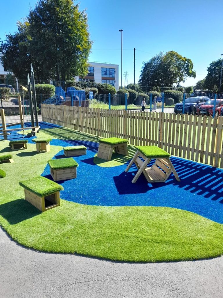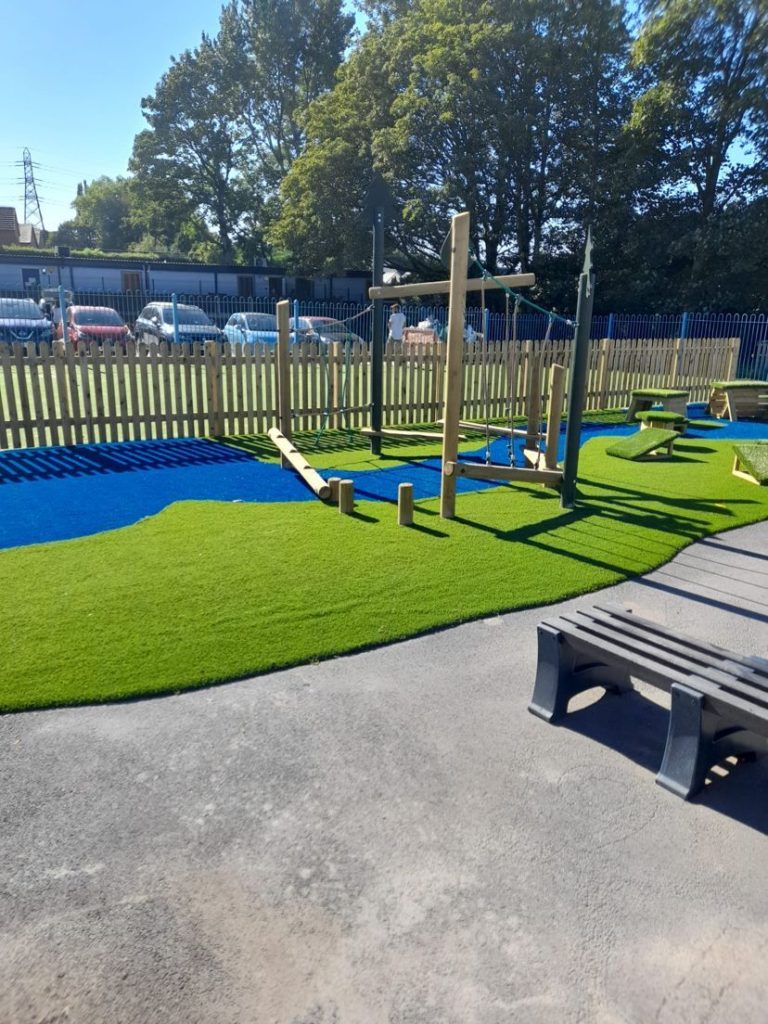 They wanted some climbing equipment but to keep it low level, they loved our open ended block set and tree trails. We suggested a combination of blue artificial grass running though the green artificial grass like a river as this would add more colour along with an element of imagination and role play. The current playground did not have any shelter and we felt it was much needed as one would provide shade in the sun and cover from the rain. The original budget was 40k but Deborah was willing to increase it to 50k to get the dream area they had wanted for so long.