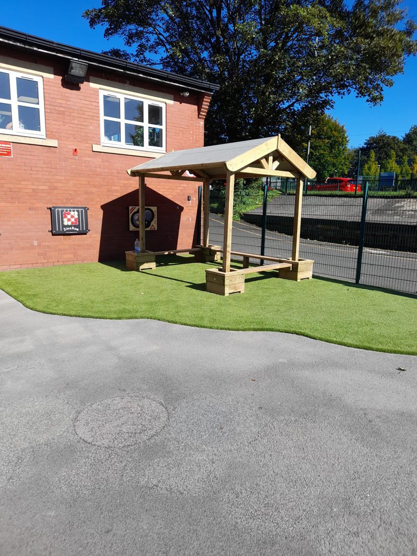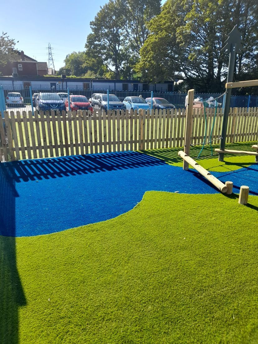 They wanted some climbing equipment but to keep it low level, they loved our open ended block set and tree trails. We suggested a combination of blue artificial grass running though the green artificial grass like a river as this would add more colour along with an element of imagination and role play. The current playground did not have any shelter and we felt it was much needed as one would provide shade in the sun and cover from the rain. The original budget was 40k but Deborah was willing to increase it to 50k to get the dream area they had wanted for so long.