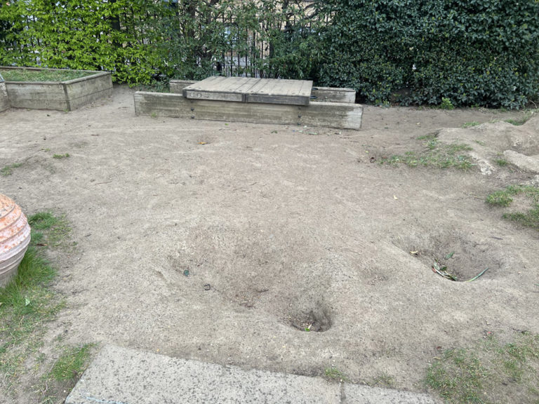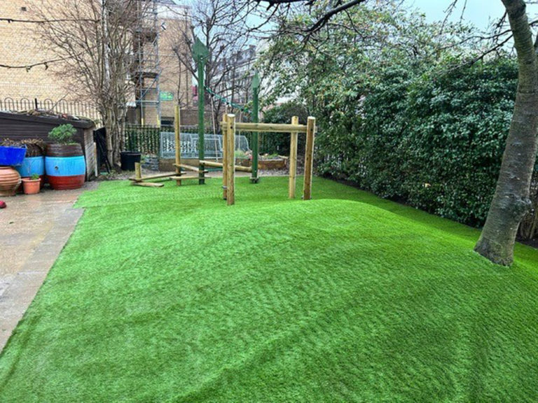 The area is a small narrow space that they wanted to be able to utilise for EYFS. The existing grass had worn down to mud. An existing cherry tree’s roots created a mound near the centre of the area which the school were keen to incorporate in the space. They wanted to include elements of equipment to increase physical activity as well as a mud pit and resurfacing of the area with artificial grass to keep a natural feel.