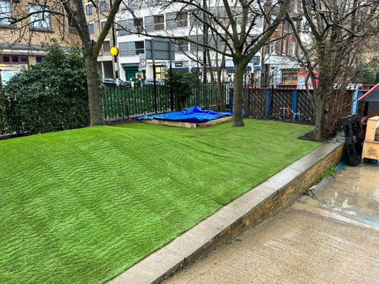 Working with the narrow space, we were able to add jungle bars and one of our tree trails from our WildWood range to help promote physical activity. The existing mound was reduced and shaped adding a feature to the centre of the space. A bespoke sleeper mud pit with PVC cover was designed for the corner of the space. We also resurfaced the space with our high quality artificial grass. The end result was a complete transformation which the children love.
