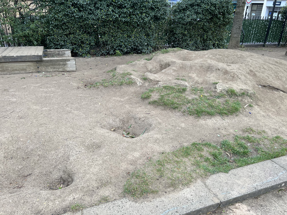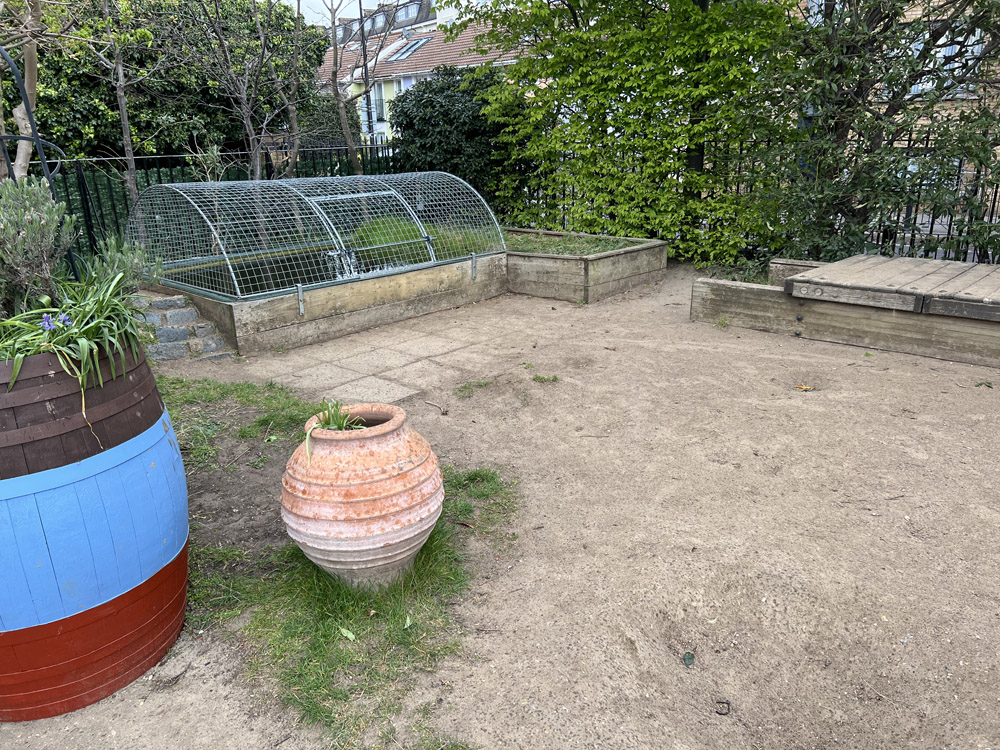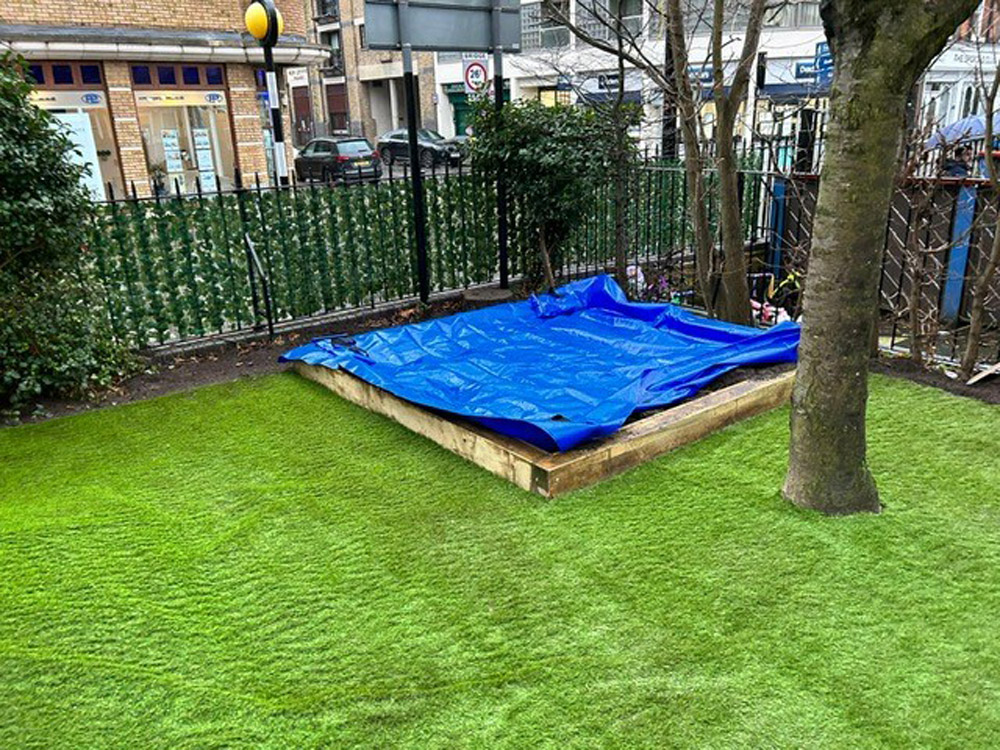 The area is a small narrow space that they wanted to be able to utilise for EYFS. The existing grass had worn down to mud. An existing cherry tree’s roots created a mound near the centre of the area which the school were keen to incorporate in the space. They wanted to include elements of equipment to increase physical activity as well as a mud pit and resurfacing of the area with artificial grass to keep a natural feel.