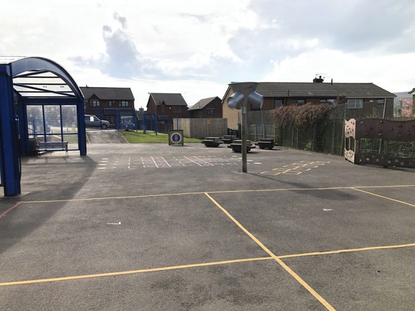 The project started with a free consultation at the school to discuss the requirement’s, take photos of the current space and carry out a survey of the area. ESP Play then created an initial design and quotation for the school ensuring it was within the 8k budget. We suggested they replace their current singled sided climbing wall with our double-sided traverse wall to allow more children to use it at one time. We replaced their existing goals with our recessed multi goal units that feature both football and basketball goals. The school already had our famous 5 Multi Skills markings, therefore we were able to utilise the existing nine square grid in the new daily mile activity marking to keep costs down for the school. The school ultimately decided to carry out the removals themselves so that they could spend more on the new equipment.