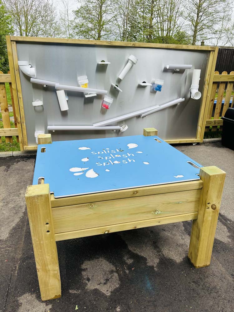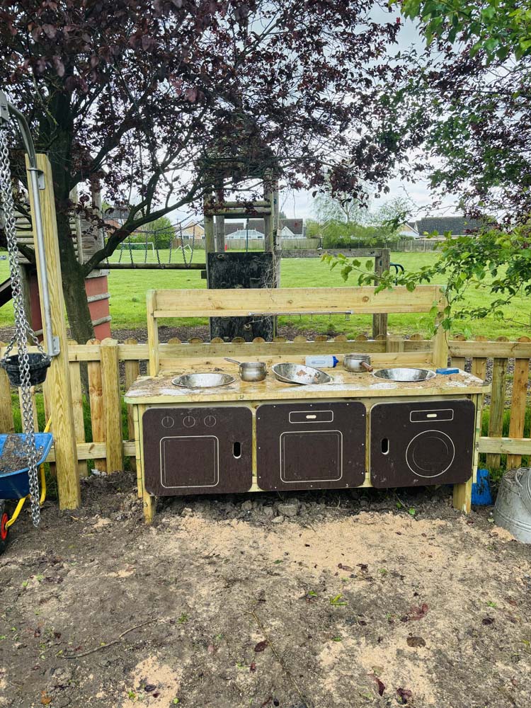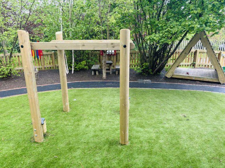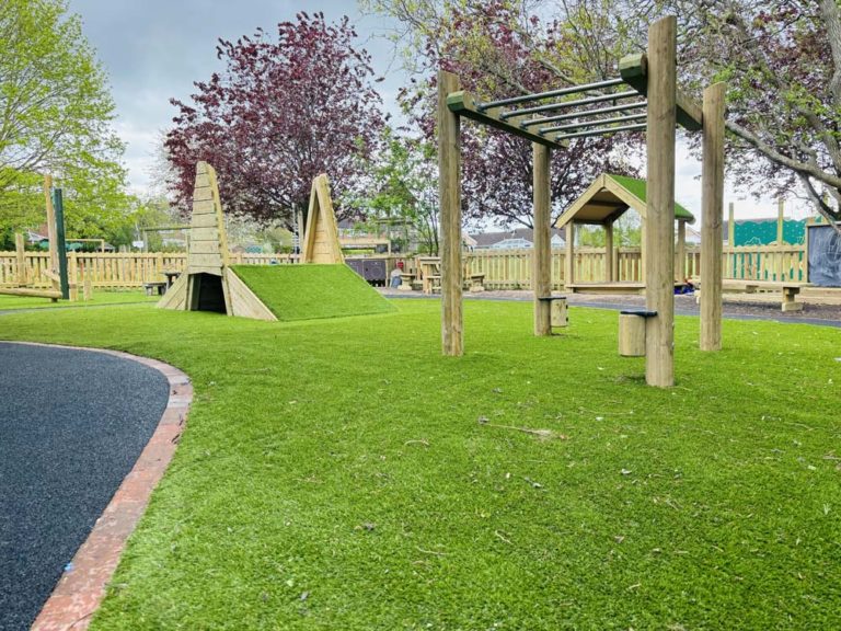 Our amazing creative team came up with a variety of open ended ideas and products to utilise throughout the area. A combination of surfaces such as artificial grass and block paving introduce a beautiful tactile experience for the children. Some of the products specifically selected for this area were Jungle Bars to target the upper body and fine motor skills, open ended movable blocks, a Mud Kitchen, a Water wall and many more as you can see throughout the images.