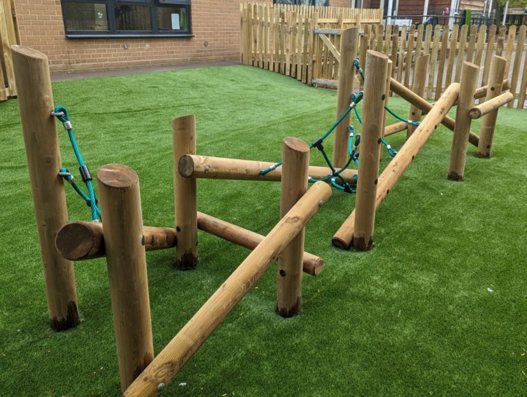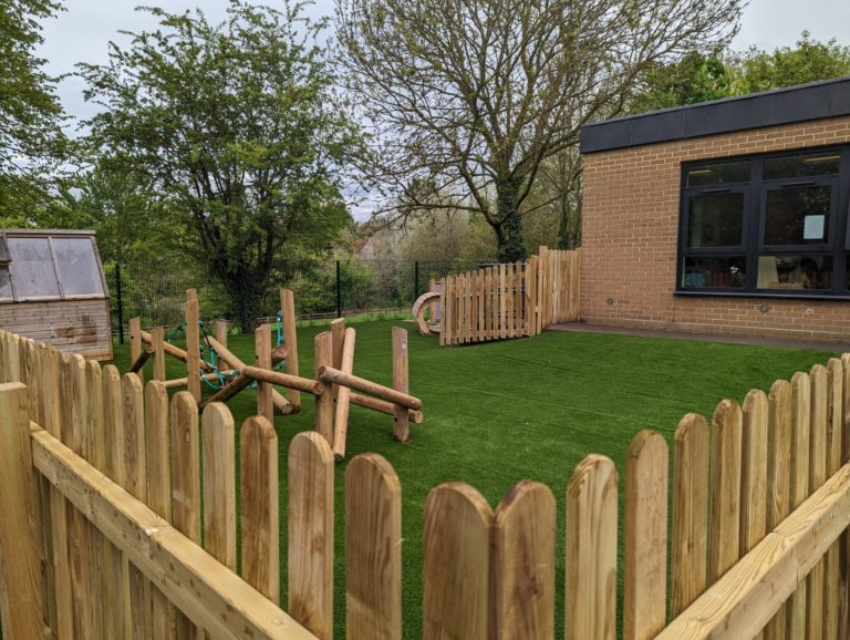 ESP have now installed a natural and engaging EYFS playground for the 4-5 year olds. ESP removed items from within the area and installed a messy play area with bark, a water wall feature, a tangled climbing frame for the children to increase their fine and gross motor skills, a hollow log tunnel and finished off with Artificial Grass surfacing and timber pickett fencing around the perimeter.