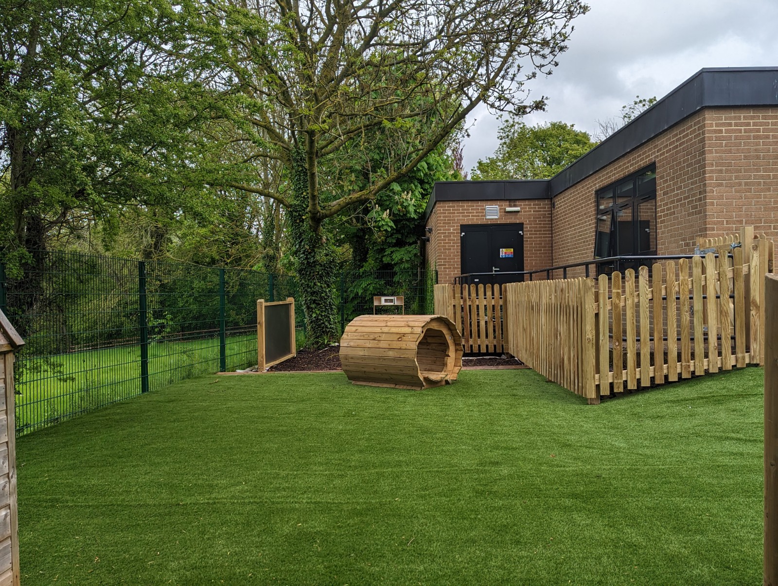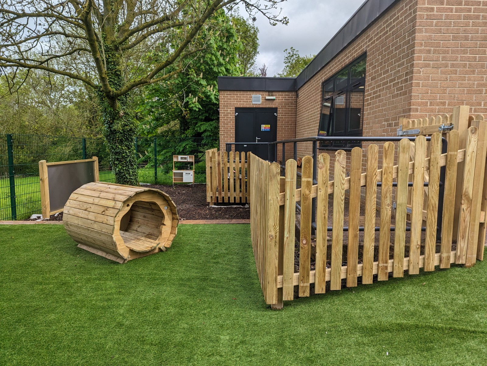 ESP have now installed a natural and engaging EYFS playground for the 4-5 year olds. ESP removed items from within the area and installed a messy play area with bark, a water wall feature, a tangled climbing frame for the children to increase their fine and gross motor skills, a hollow log tunnel and finished off with Artificial Grass surfacing and timber pickett fencing around the perimeter.
