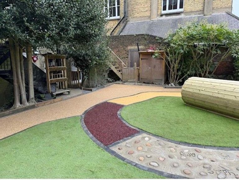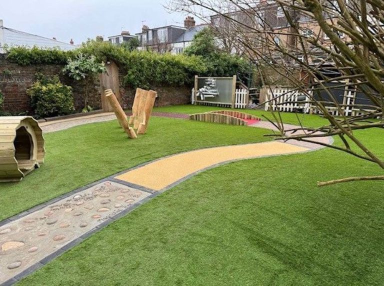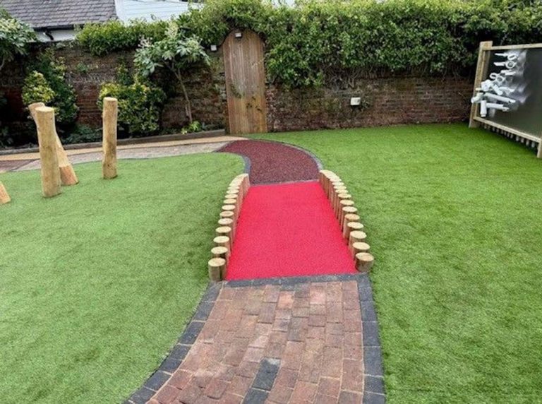 The whole play area has been resurfaced using a mix of resin bound gravel and artificial grass to keep a really natural appearance and feel to the garden.