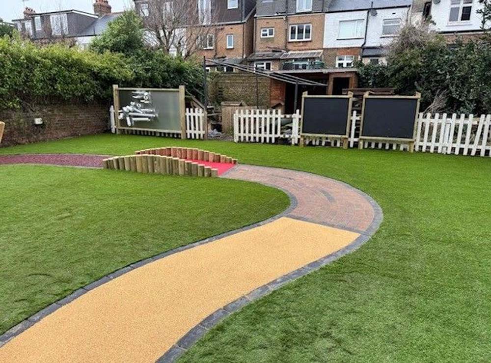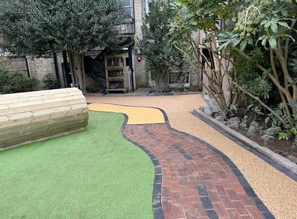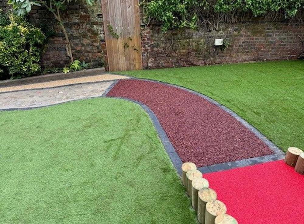 The whole play area has been resurfaced using a mix of resin bound gravel and artificial grass to keep a really natural appearance and feel to the garden.
