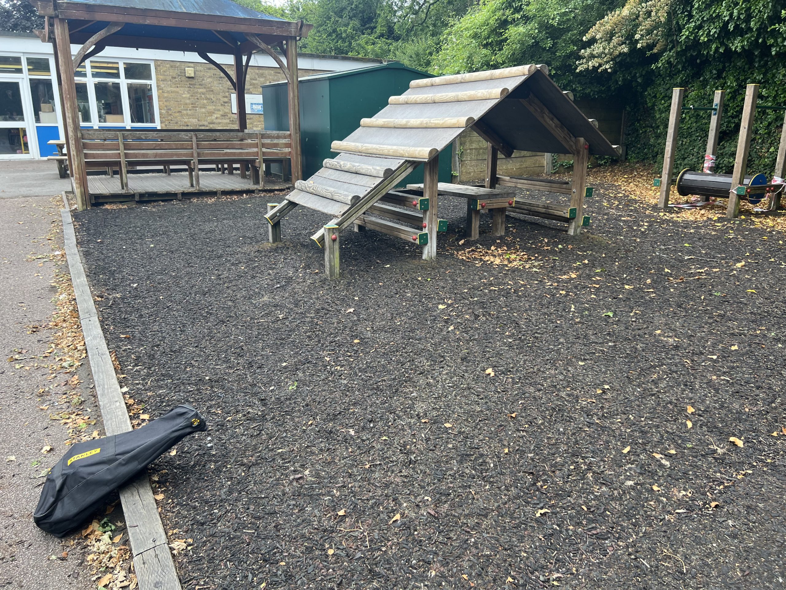 The school’s priorities were clear. The perimeter edging, which had become worn and unsafe, needed to be fully removed and replaced. The space also needed new AG surfacing along with dedicated quiet zones where children could gather. Seating was key, especially around the much-loved train and hut, both of which were to be retained. A small performance stage was also on the wish list to support creative expression and role-play.