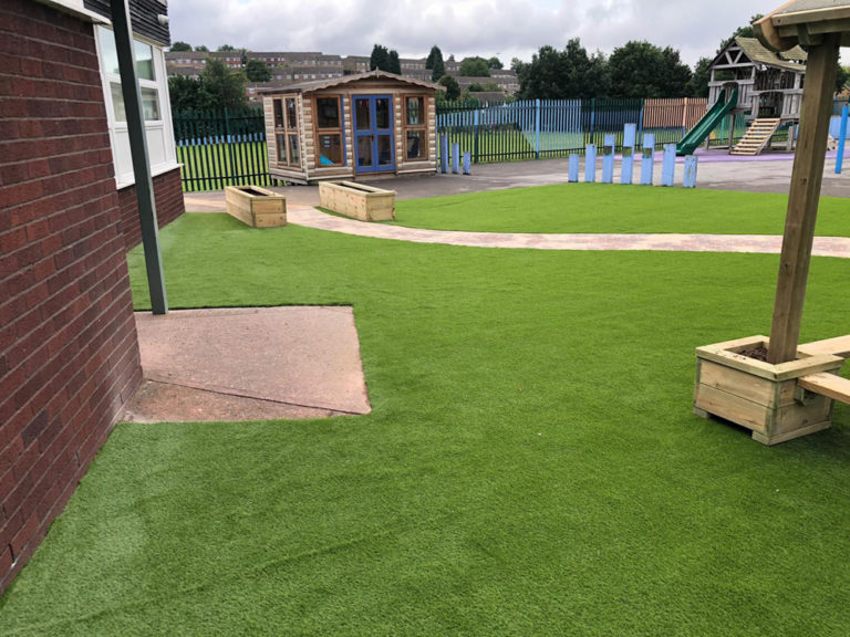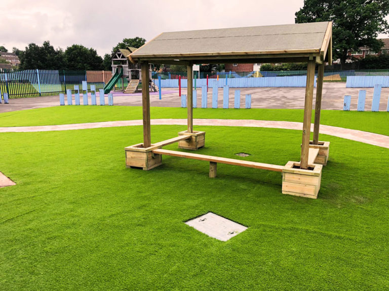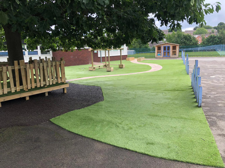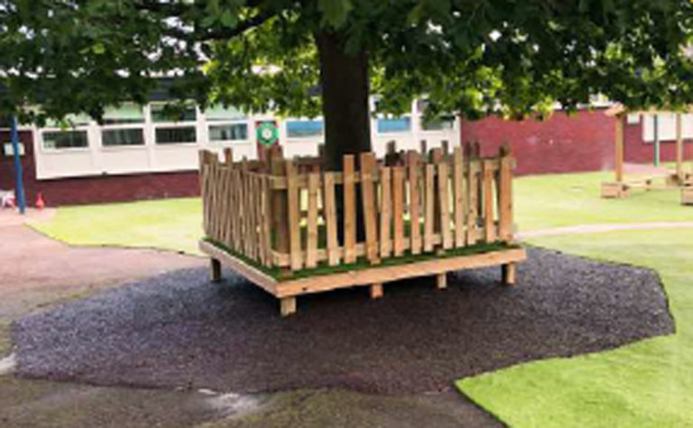 Westglade Primary School wanted to refresh and enhance their existing KS2 playground with surfacing and seating options that would bring the area to life. With a limited budget we wanted to give the best options to make the most of what they had. We laid the area with multiple surfaces including a block paving pathway running through artificial grass, this leads up to the raised tree den which is laid to rubber mulch.