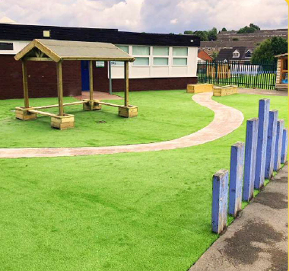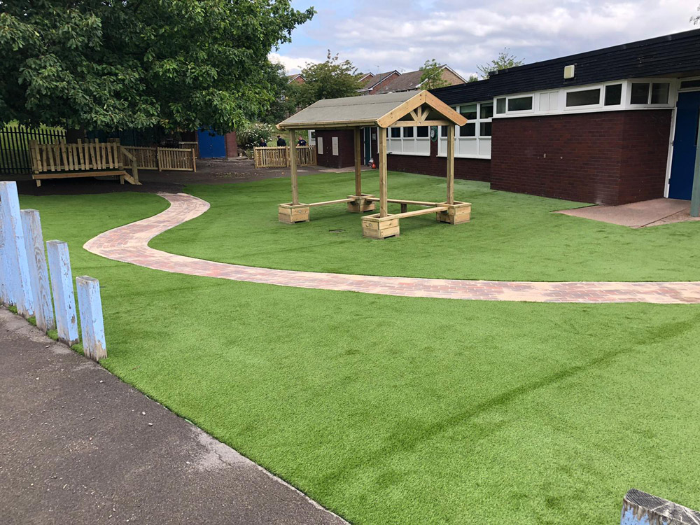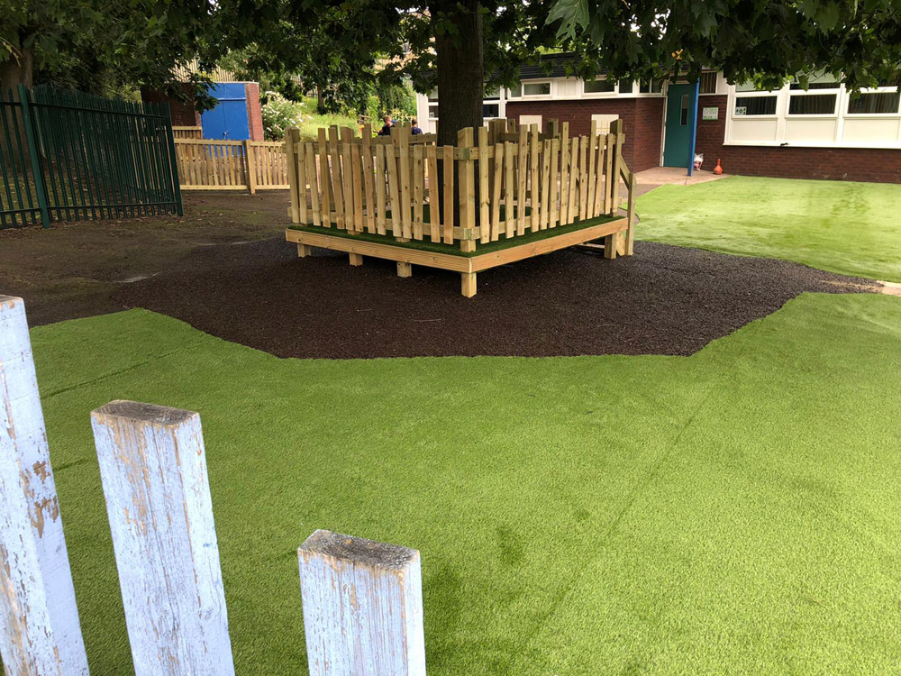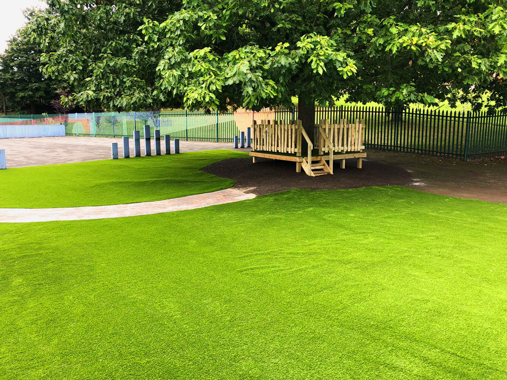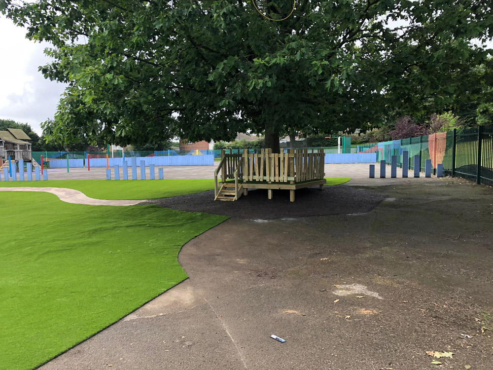 Westglade Primary School wanted to refresh and enhance their existing KS2 playground with surfacing and seating options that would bring the area to life. With a limited budget we wanted to give the best options to make the most of what they had. We laid the area with multiple surfaces including a block paving pathway running through artificial grass, this leads up to the raised tree den which is laid to rubber mulch.