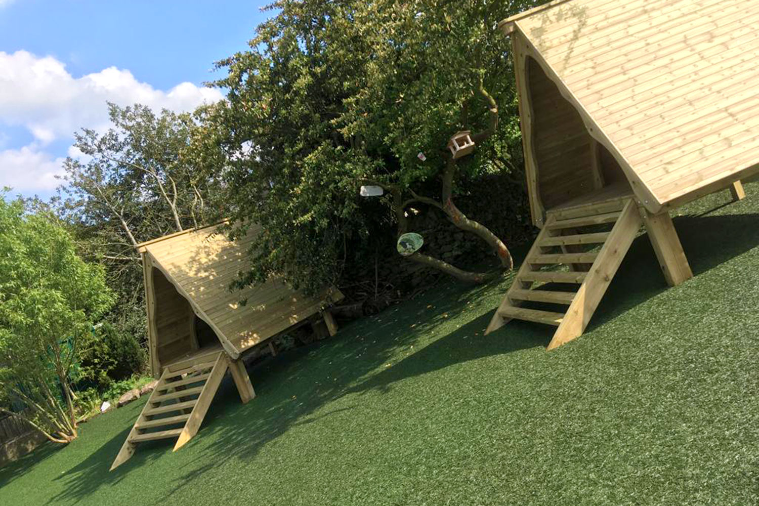 Feature seating also comes in the form of toadstools and storytelling chairs, while interestingly designed shelters can be found in our range of forest play huts, each kept dry by a roof carpeted in artificial grass. One of these doubles up as a picnic table while another even has doors to close out the wind and rain.